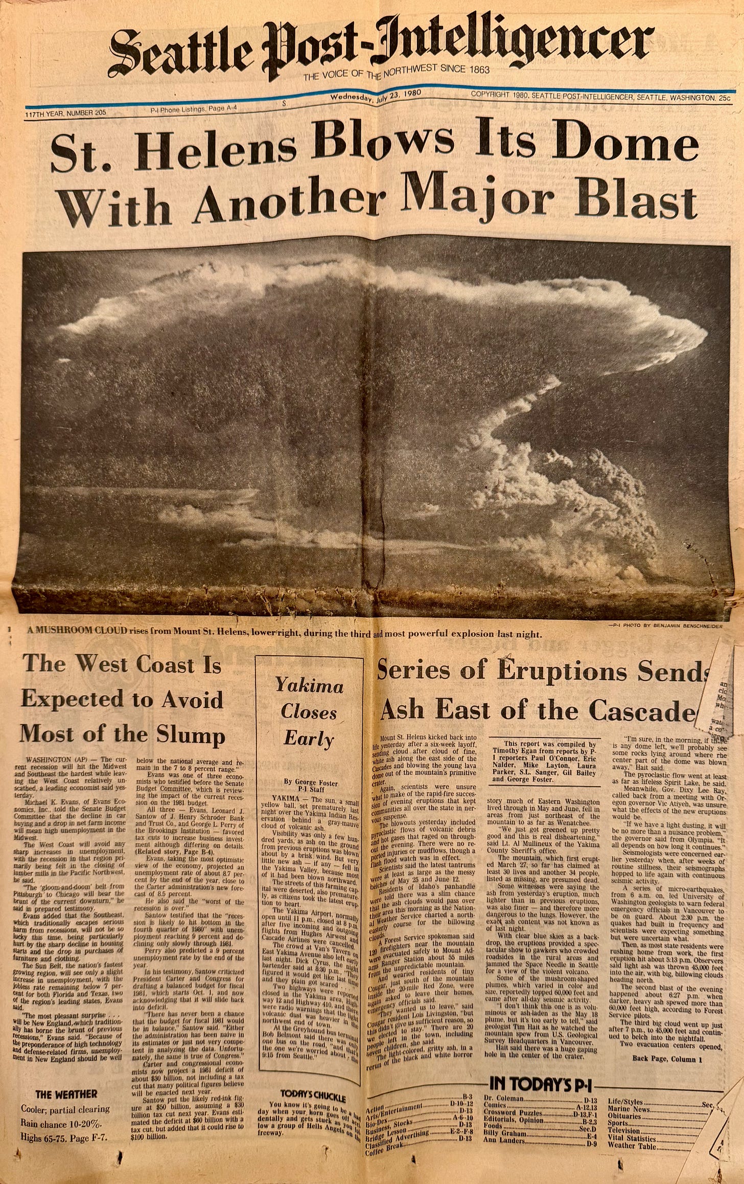 I also found an original 46 year-old newspaper from July 23, 1980 - the day Mount Saint Helens exploded in Washington state, the most destructive volcanic eruption in US history. The ash fell throughout the whole state and into 10 others, as well as several Canadian provinces. My parents described ash falling like snow almost 300 miles away. The Seattle Post-Intelligencer is apparently the oldest west-coast newspaper, and was the first to go fully digital in 2009.