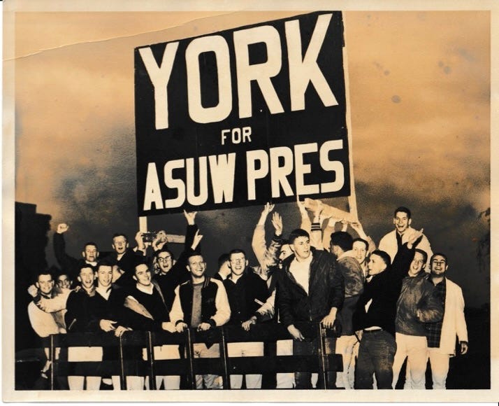 In the treasure-trove of sepia and black-and-white photos from my dad’s college years in the early 1960s, here are two stand-outs. On the left, my dad’s fraternity brothers holding up a sign supporting his bid for Student Body President of the University of Washington, which he went on to win. On the right, a signed photo of my dad (on the left) with WA Democratic state Senator Henry M. Jackson. I believe this was on a trip to D.C. with the American Boys Legion.